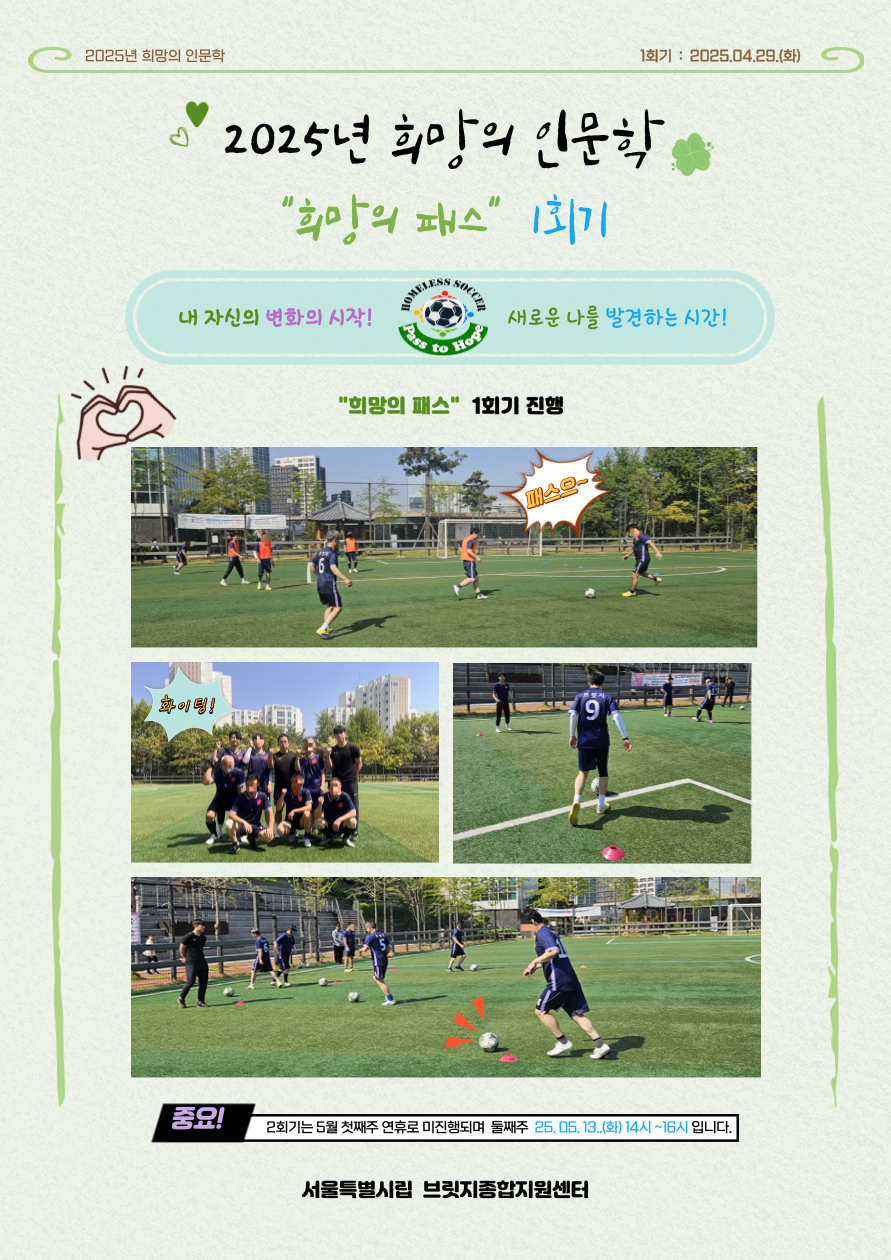 ¡Û ÀÏ ½Ã : 2025³â 4¿ù 29ÀÏ(È) 14:00 ~ 16:00 ¡Û Àå ¼Ò : ¼Õ±âÁ¤°ø¿ø ³» Ã౸Àå ¡Û ° »ç : Á¤¹Î¹ü ÄÚÄ¡ ¡Û ³» ¿ë - ³îÀ̸¦ ÅëÇÑ ±âÃÊü·Â ÈÆ·Ã - ÆÀ¿öÅ© ¹× Àü¼ú(2:1 ÆÐ½º µî) ¹× µå¸®ºí ÈÆ·Ã - ¹Ì´Ï°ÔÀÓ(5:5) ÁøÇà. ¡Ø ´ÙÀ½ ÀÏÁ¤Àº 5¿ù ùÁÖ ¿¬ÈÞ·Î ¹ÌÁøÇàµÇ¸ç 5¿ù µÑ°ÁÖ 25. 05. 13.(È) 14:00 ~ 16:00 ¼Õ±âÁ¤°ø¿ø ³» Ã౸Àå ÁøÇàµË´Ï´Ù.